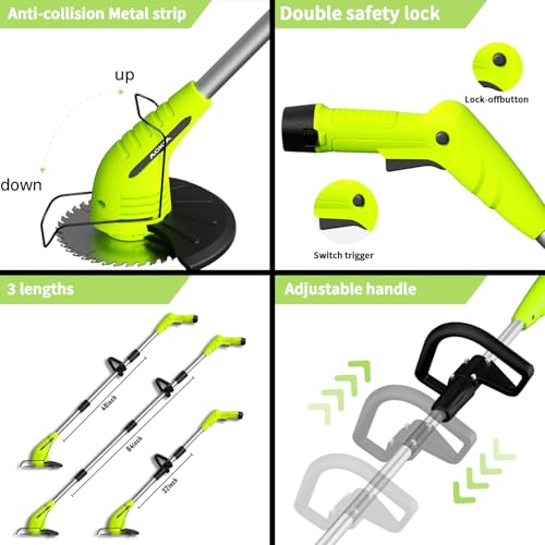 Click for More Images ?Upgraded Electric Weed Wacker? Our cordless weed wacker battery operated has passed the professional design and safety test. The cordless grass trimmer has been upgraded with smoother wheels, higher-strength blades and...